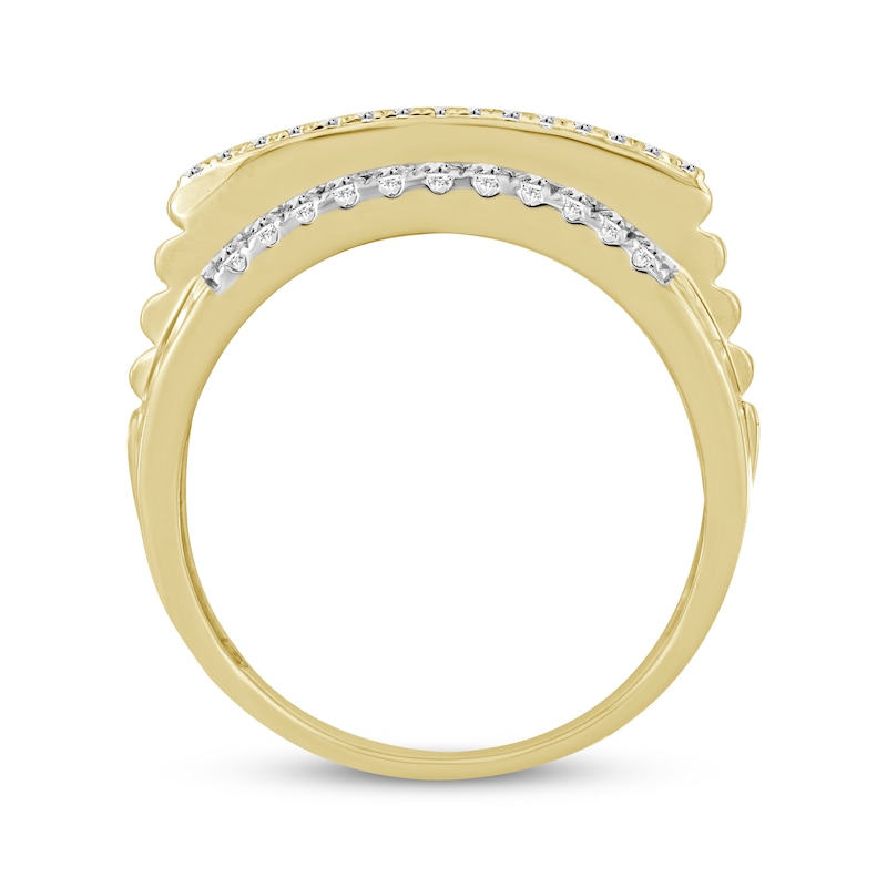 This remarkable ring shines with splendid diagonal rows of round and baguette-cut diamonds traced by round diamonds at the center. More round diamonds line the top and bottom, while the sides of the band showcase eye-catching grooves. The ring is crafted in 10K yellow gold with white rhodium contrast and has a total diamond weight of 1 carat.
