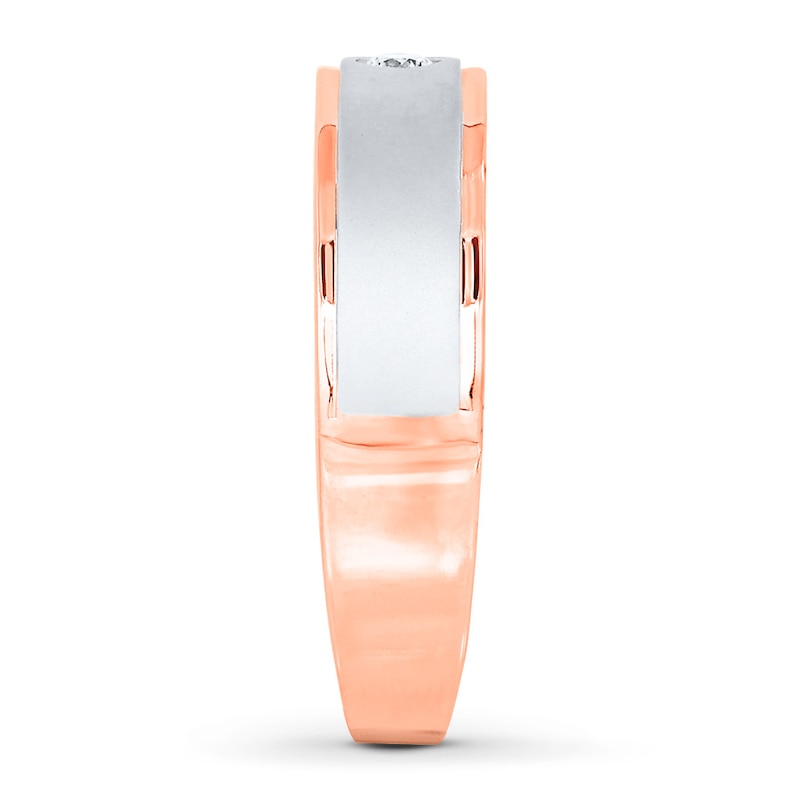 A single sparkling round 1/15 carat diamond is bezel-set into this band for him. The ring is crafted of 10K rose gold with a white rhodium flash.