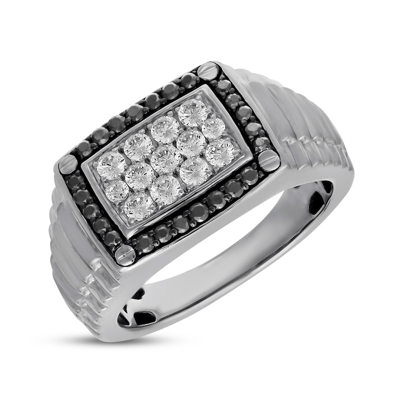 This sleek men's ring features a cluster of brilliant round-cut white diamonds at its center, framed by bold black diamonds. The sides offer a ridged effect for eye-catching dimension. The ring is set in classic 10K white gold and has a total diamond weight of 1 carat.