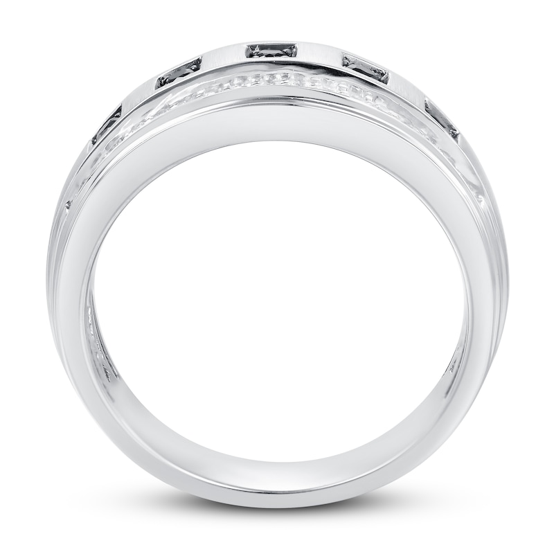 This handsome men's wedding band features five bold round-cut black diamonds across the center, each set in a black rhodium flash. The satin-finished 10K white gold band is lined above and below with brilliant round-cut white diamonds, giving the ring a total diamond weight of 1/2 carat. From the Now & Forever® collection.