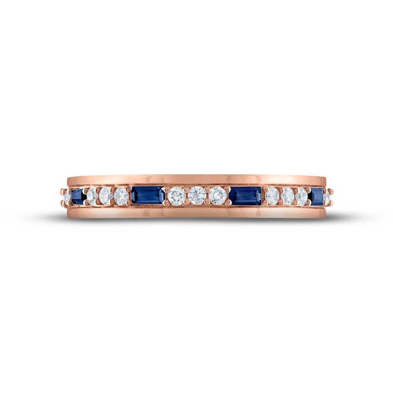 A vibrant choice, this dapper wedding band for him is styled in 10K rose gold. Bright baguette-cut blue sapphires alternate with trios of shining round diamonds across the center. The ring has a total diamond weight of 1/5 carat and is from our Now & Forever® collection.