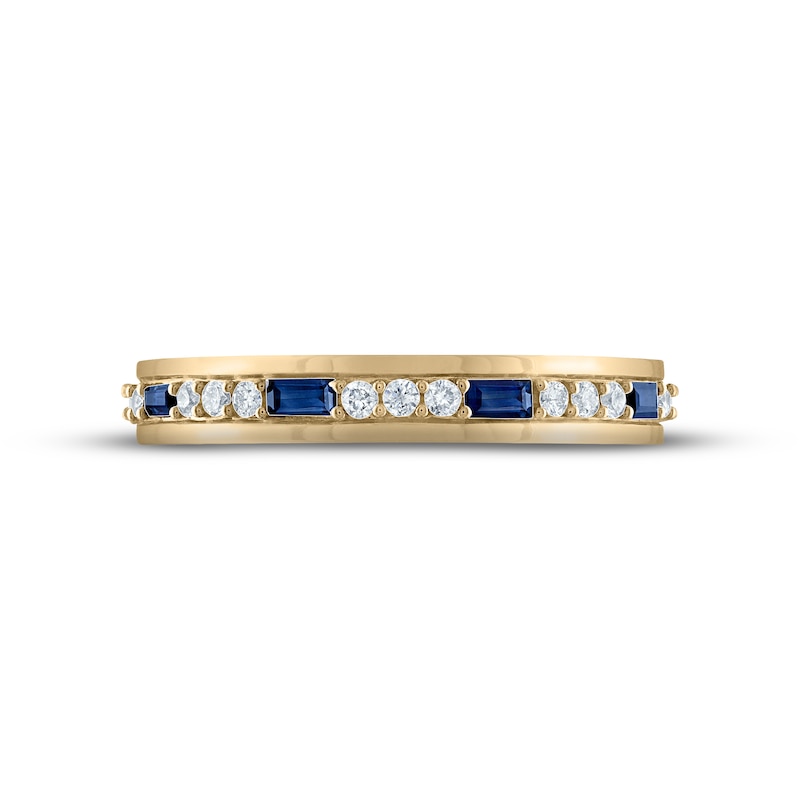 This stately wedding band for him showcases vivid baguette-cut blue sapphires alternating with trios of radiant round diamonds. Styled in 10K yellow gold, the ring has a total diamond weight of 1/5 carat. From the Now & Forever® collection.