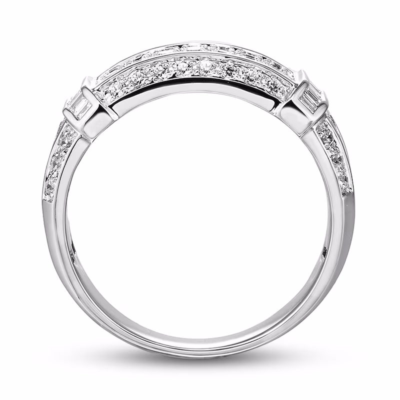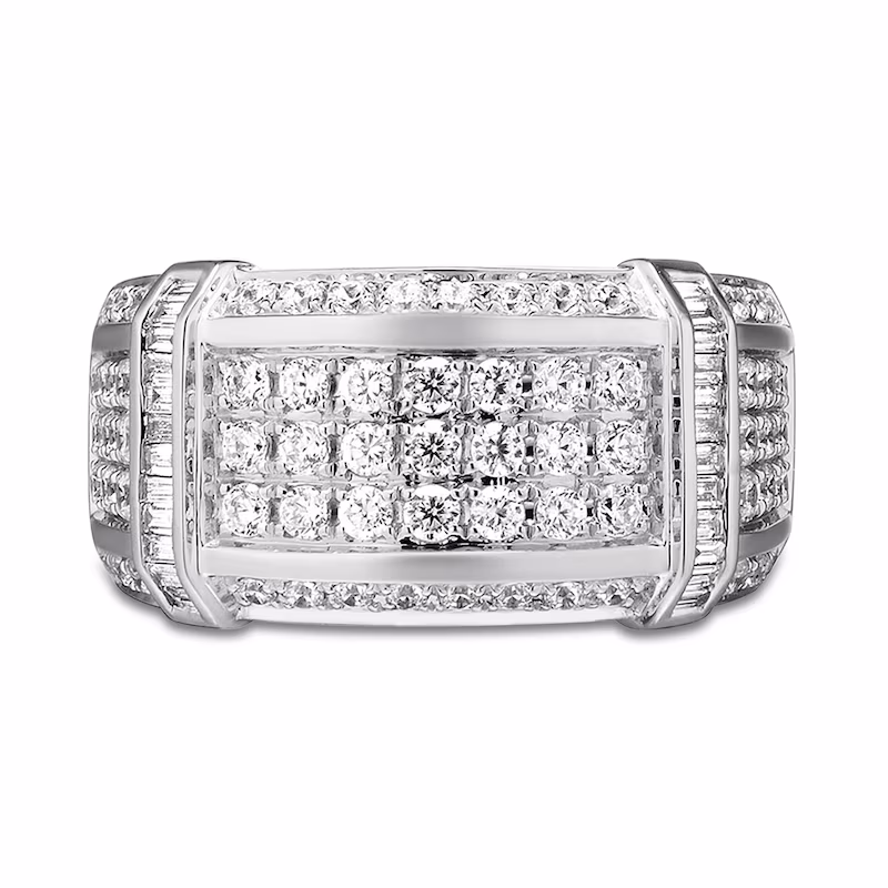 Three sparkling rows of round diamonds adorn the center of this distinguished men's band, while vertical rows of baguette diamonds provide contrasting brilliance. More diamonds edge the band to bring the total diamond weight to 1 1/2 carats. The ring is styled in high-polish 10K white gold.