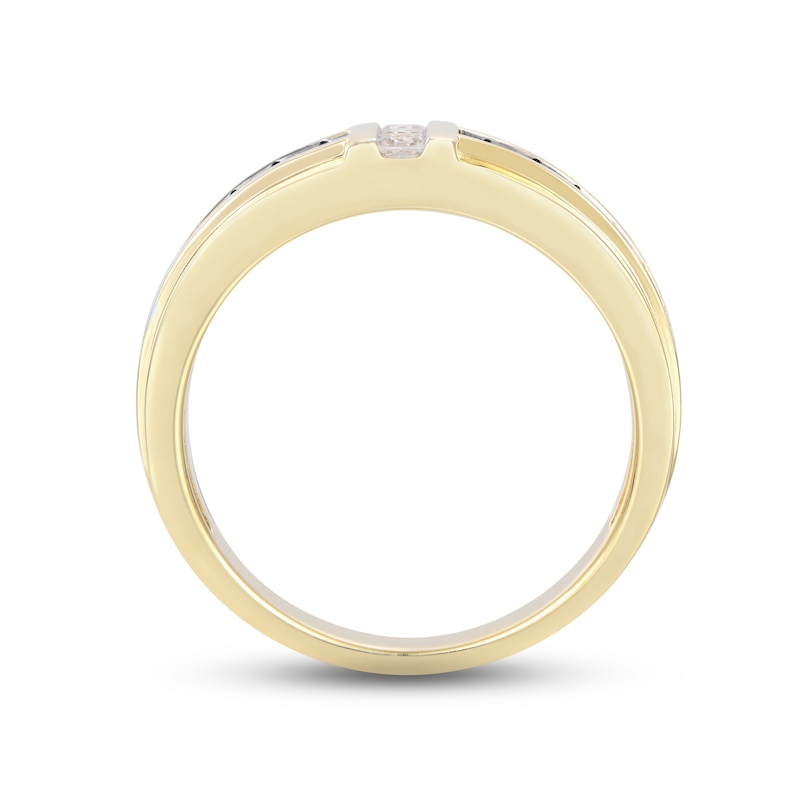 This handsome wedding band for him features a vertical trio of square-cut diamonds at the center. Round-cut blue sapphires adorn the timeless 10K yellow gold band, bringing a touch of vibrant color that draws the eye. The ring has a total diamond weight of 1/5 carat. From the Now and Forever® collection.