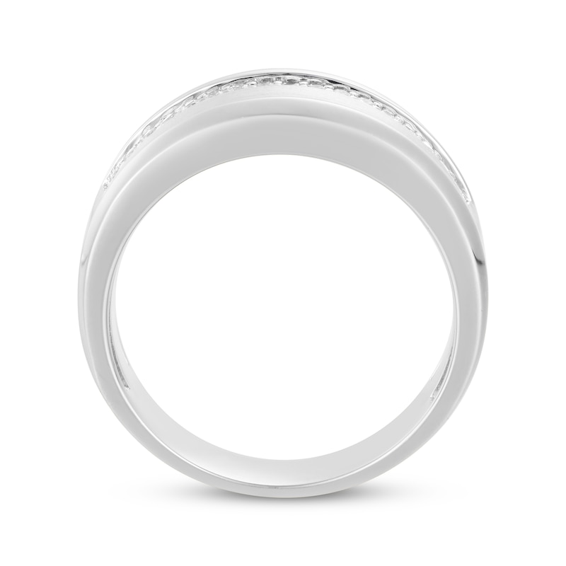 This stunning wedding band features two radiant rows of round diamonds shining along the top and bottom of the subtly curved silhouette. Styled in 10K white gold with brushed finish detailing, the band has a total diamond weight of 1/3 carat. From the Now & Forever® collection.