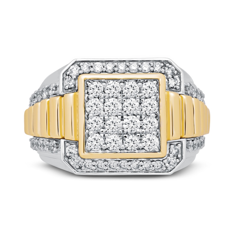This bold ring for him showcases a two-tone design and square-shaped center design. Four rows of brilliant round diamonds sparkle at the center, framed in 10K yellow gold. More round diamonds surround the center design and shimmer down the band for a total diamond weight of 2 carats. The ring is set in classic 10K white gold and features 10K yellow gold accent.