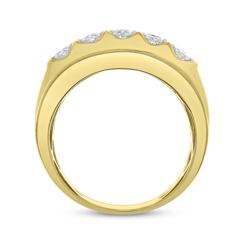 This radiant ring for him showcases five brilliant duos of round diamonds shining across the center, as well as two horizontal rows of round diamonds on the top and bottom. The wide band is styled in polished 10K yellow gold with a rhodium finish and has an impressive total diamond weight of 2 carats.