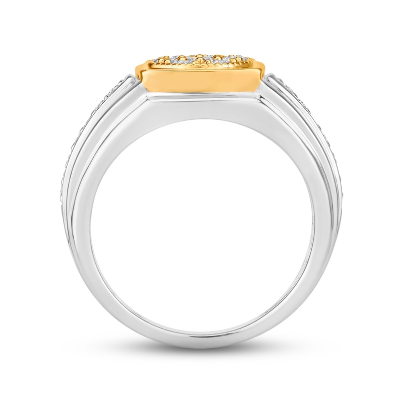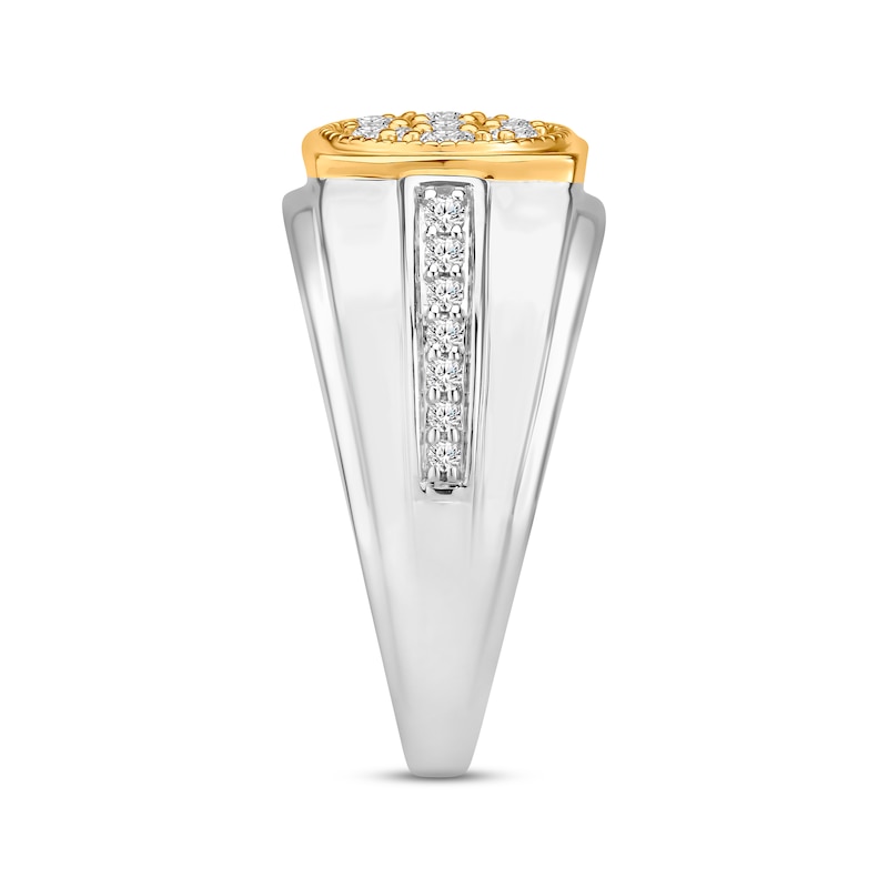 This distinguished ring for him features a brilliant cluster of round-cut diamonds at its center. A row of additional round diamonds shines along the 10K white gold band, giving the ring a total diamond weight of 3/4 carat. Classic 10K yellow gold detailing around the center adds a striking two-tone contrast.