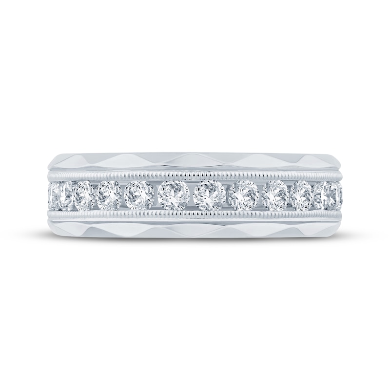 Seal your vows with this stunning wedding band. Brilliant channel-set round diamonds gleam across the center, framed by milgrain accents. Wave-like grooves adorn the sleek band, which is crafted in modern 10K white gold with a rhodium finish. The ring has a total diamond weight of 1 carat. From the Now & Forever® collection.