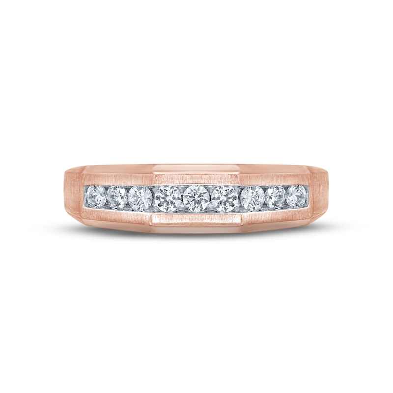 This remarkable wedding band for him is styled in radiant 10K rose gold with brilliant round diamonds gleaming in white rhodium for a sleek contrast. The angled band has a total diamond weight of 1/2 carat. From the Now and Forever® collection.