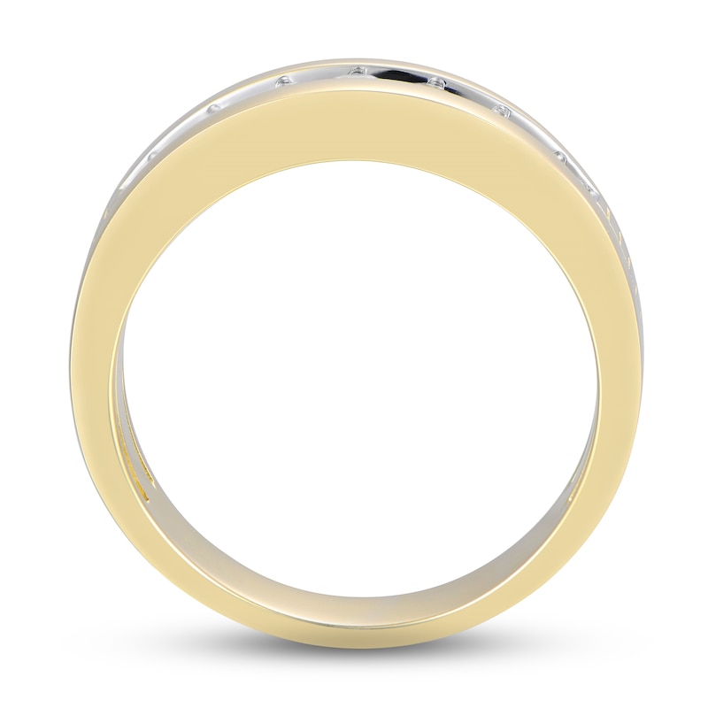 This handsome men's wedding band showcases a striking row of channel-set round diamonds. Engraving details along the 10K yellow gold band complete the swanky look. The ring has a total diamond weight of 1/2 carat. From the Now & Forever®collection.
