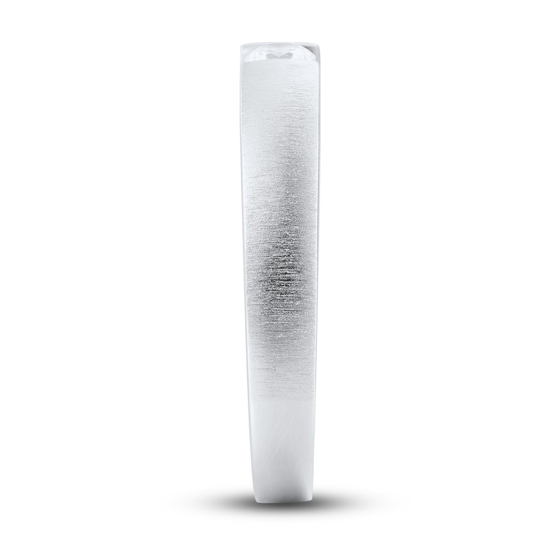 A dignified and meaningful symbol of your love, this men's wedding band displays a sparkling round-cut diamond at the center. The 10K white gold band features a brushed finish and has a total diamond weight of 1/5 carat. From the Now and Forever® collection.