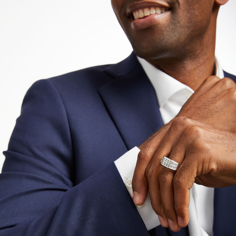 Two rows of brilliant round diamonds adorn the bold angles of this commanding wedding band for him. Styled in iconic 10K white gold, the diamonds total 1 carat in weight. From the Now and Forever® collection.