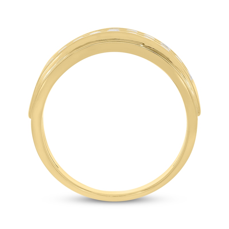 He'll appreciate the dazzling good looks of this diamond ring. Polished and stepped 10K yellow gold frames are filled with twin rows of round diamonds. This distinguished design is set with 1 carat total weight of diamonds. From the Now & Forever® bridal collection.