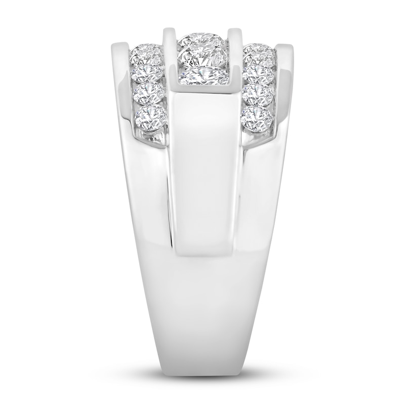 Three rows of brilliant round-cut diamonds sparkle at the center of this gorgeous wedding band for him. The 10K white gold band boasts a total diamond weight of 2 carats. From the Now & Forever® collection.