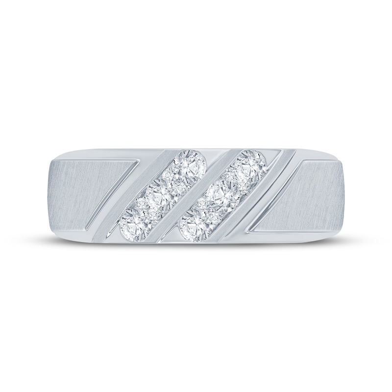 A handsome token of your love for one another, this dapper wedding band features two diagonal rows of radiant round diamonds set amidst sleek grooves. Crafted in satin-finished 10K white gold with rhodium plating, the ring has a total diamond weight of 3/8 carat. From the Now & Forever® collection.
