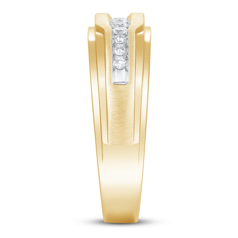 This stately yet classic wedding ring for him shines with 1/4 carat in total diamond weight across the top of the 10K yellow gold band. Beaming with sparkle, the white rhodium flash gives this ring extra shine that is sure to show your love.