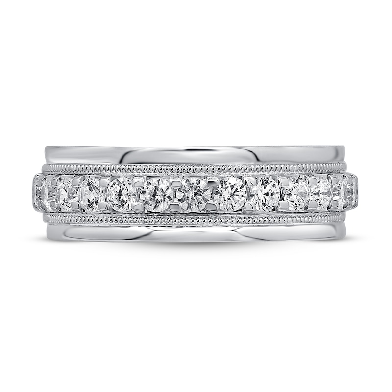 This dashing diamond wedding ring for him has elegant glowing round diamonds encrusted along the 10K white gold band, creating a bold and refined look. The ring has a total diamond weight of 1 carat.