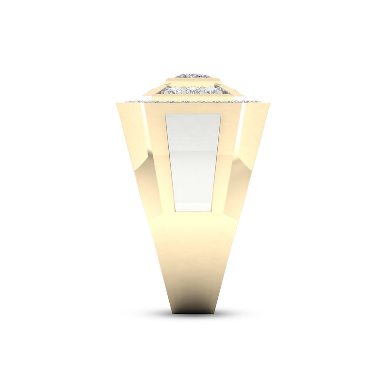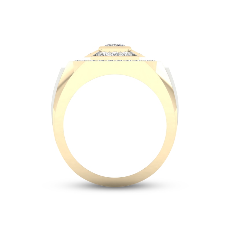 This striking statement ring features a 3/4-carat square-cut lab-created diamond framed by an array of shimmering round lab-created diamonds in the geometric-inspired silhouette. Crafted in 14K white and 14K yellow gold, the band is completed with engraved and high polish finishes. Each lab-created diamond is independently certified with a total lab-created diamond weight of 1 1/2 carats. From the Lab-Created Diamonds by KAY collection.