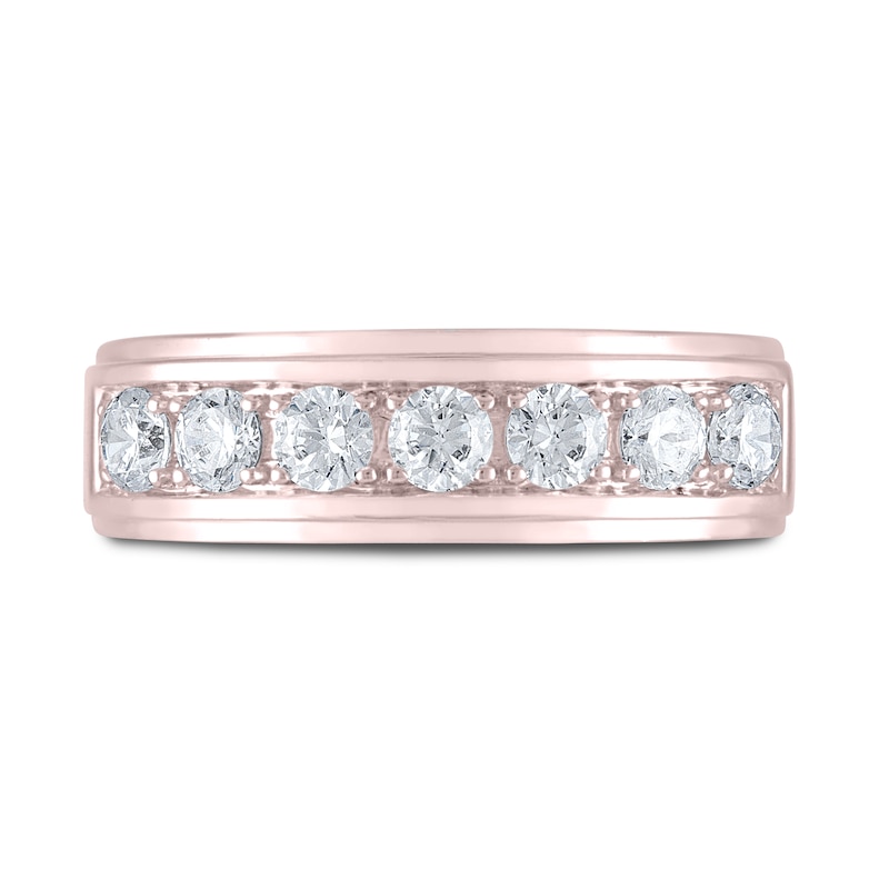 This handsome men's wedding band from THE LEO Diamond® collection showcases a gorgeous row of brilliant round-cut independently-certified diamonds. The diamonds sparkle against the vintage-inspired 14K rose gold band, totaling 1 carat in weight.