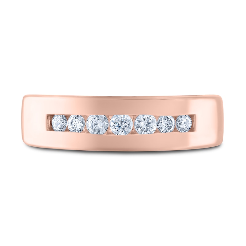 This handsome men's wedding band from THE LEO Diamond® collection showcases a gorgeous row of brilliant round-cut independently-certified diamonds. The diamonds are channel-set in the vintage-inspired 14K rose gold band, totaling 3/8 carat in weight.