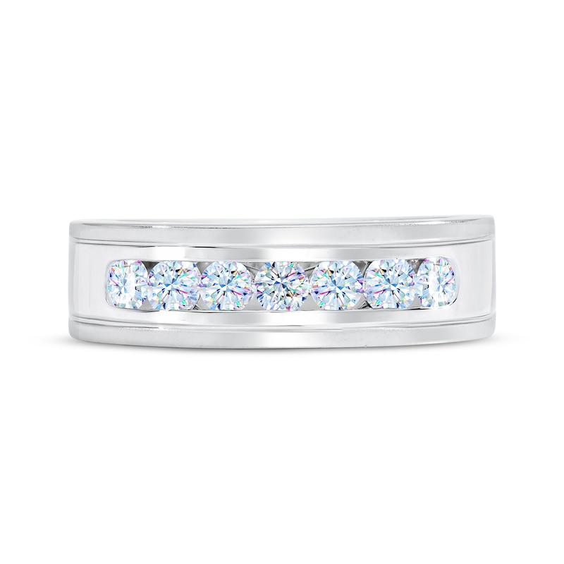 This handsome men's wedding band showcases a resplendent channel-set row of First Light® diamonds. From Leo Schachter, the independently-certified diamonds feature Fire Prism™ technology that creates infinite flashes of color for more fire and sparkle. The ring is styled in classic 14K white gold and has a total diamond weight of 3/4 carat.