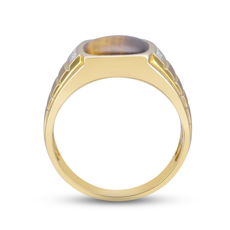 A rich cushion-cut tiger's eye quartz gleams at the center of this striking ring for him. Accents of round diamonds shine on either side, adding a hint of sparkle to the bold 10K yellow gold band.