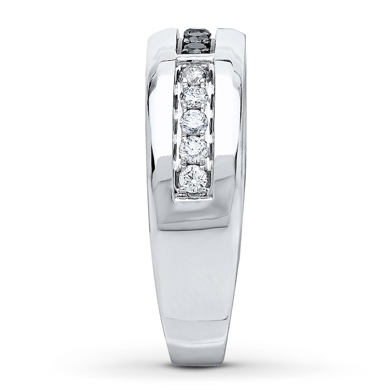 A row of black diamonds is flanked by rows of white diamonds as the focal point of this handsome men's wedding band. Crafted in 10K white gold, the ring totals 3/8 carat of diamonds. From the Now & Forever® Bridal Collection.