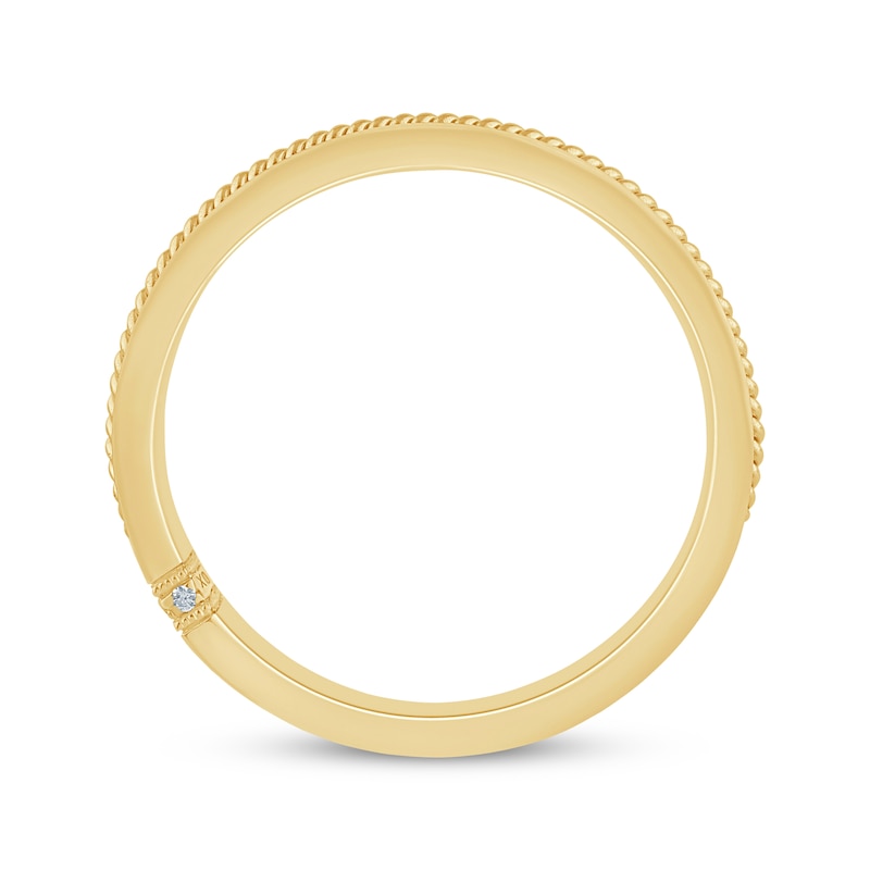 A signature element of white diamonds in milgrain detailing encircles the band, symbolizing unity and eternal love