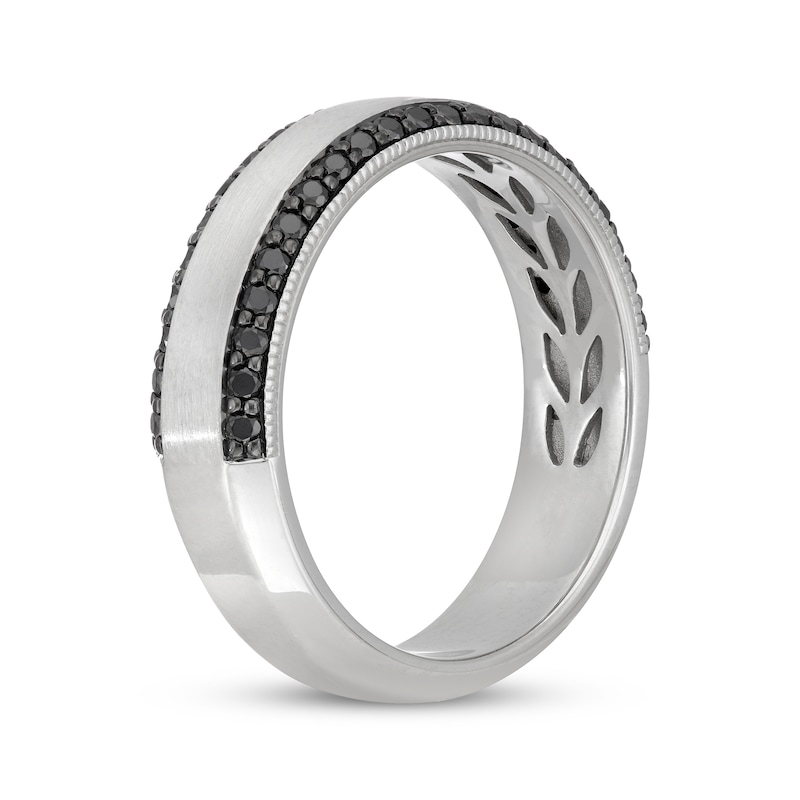 From the Neil Lane collection, this distinguished men's wedding band is crafted of 14K white gold and edged in round black diamonds. The ring has a total diamond weight of 1/2 carat.