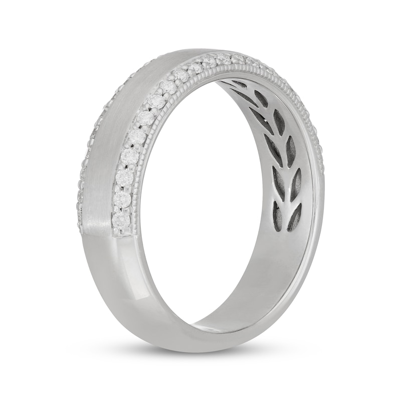 This distinguished Neil Lane™ men's wedding band features brilliant lines of round diamonds and a brushed finish on the 14K white gold band for a contemporary look. The ring has a total diamond weight of 1/2 carat.