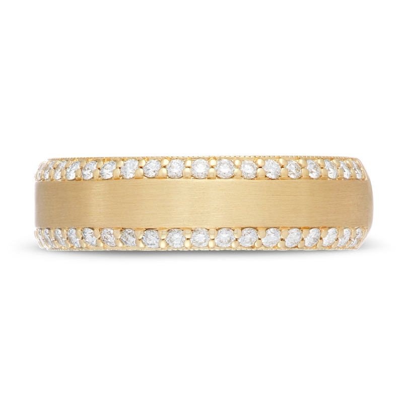 This striking diamond wedding band for him is from the Neil Lane™ collection and features a classic 14K yellow gold band with edges traced in bright round diamonds. The handsome band has a total diamond weight of 1/2 carat. The surface of the ring has a brushed surface to add the finishing touch.