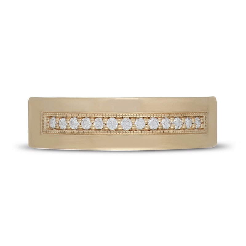 This sleek men's wedding band from Neil Lane® collection features a striking line of round diamonds framed in milgrain detailing. Crafted of 14K yellow gold, the band has a total diamond weight of 1/6 carat.