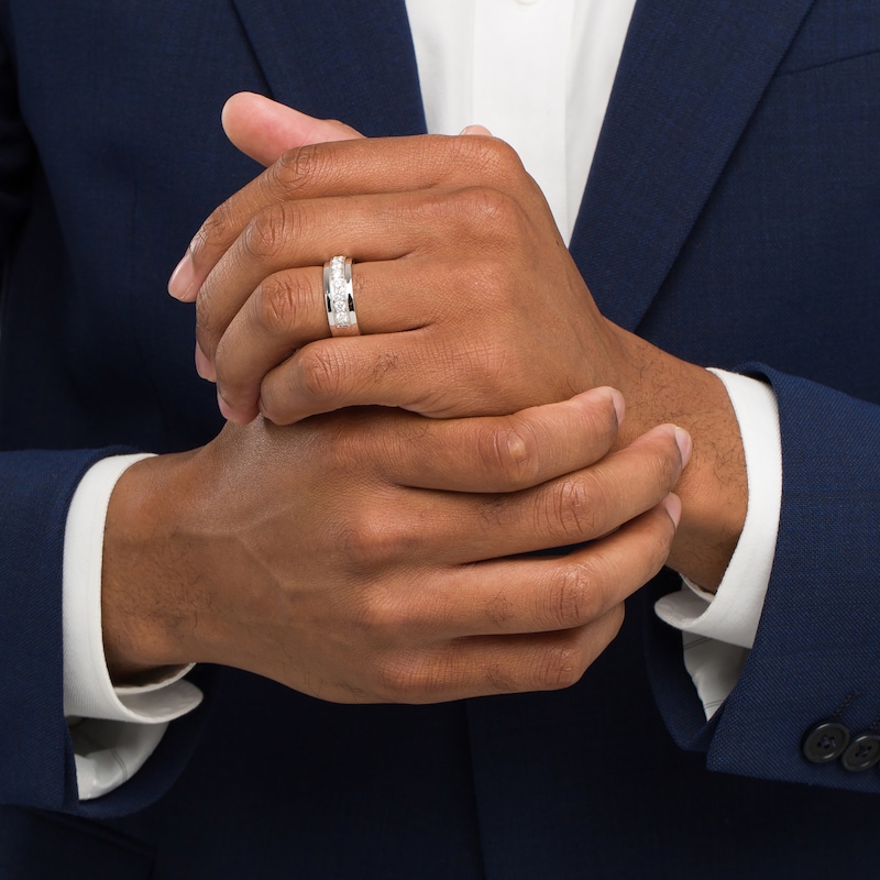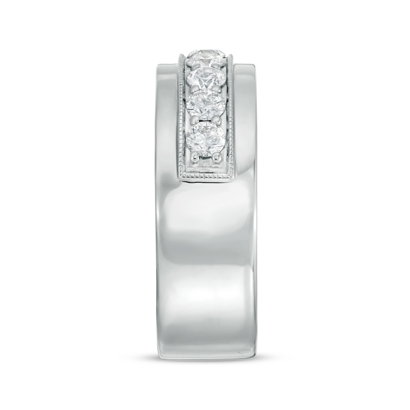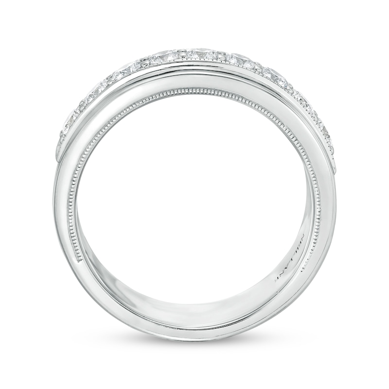 A timeless design with a contemporary feel, this men's wedding band from the Neil Lane™ collection features a sparkling row of round diamonds edged in milgrain beading. Additional milgrain detail lines the inner edge of the 14K white gold band to complete the look. The ring has a total diamond weight of 1 carat.