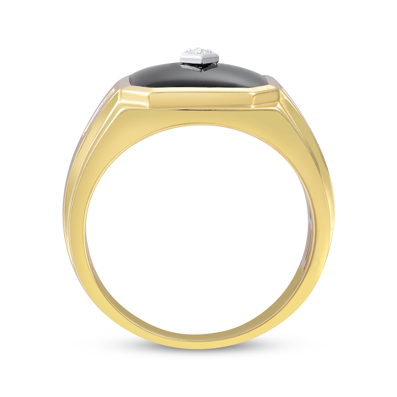 This stunning ring for him is crafted in 10K yellow gold and features an intense emerald-cut black onyx. Bright round diamond accents are styled in white rhodium for a hint of sparkling contrast. Available online while supplies last. Previously Owned Treasures are not eligible for in-store pickup. Previously Owned Treasures may only be shipped either to your home address or to an alternate address. Price comparison based on new item pricing.