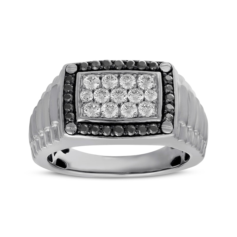 This sleek men's ring features a cluster of brilliant round-cut white diamonds at its center, framed by bold black diamonds. The sides offer a ridged effect for eye-catching dimension. The ring is set in classic 10K white gold and has a total diamond weight of 1 carat. Available online while supplies last. Previously Owned Treasures are not eligible for in-store pickup. Previously Owned Treasures may only be shipped either to your home address or to an alternate address. Price comparison based on new item pricing.