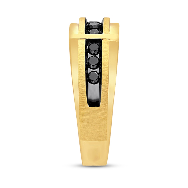 Round black diamonds lend sharp contrast to this striking 10K yellow gold men's band. Supreme-Fit® for maximum comfort, the ring has a total diamond weight of 1/2 carat. Available online while supplies last. Previously Owned Jewelry is not eligible for in-store pick-up. Previously Owned Jewelry may only be shipped either to your home address or to an alternate address. Price comparison based on new item pricing.
