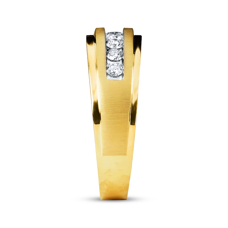 A row of nine round diamonds creates the timeless style in this wedding band for him. Crafted in 10K yellow gold, the ring has a total diamond weight of 1/2 carat. Available online while supplies last. Previously Owned Treasures are not eligible for in-store pickup. Previously Owned Treasures may only be shipped either to your home address or to an alternate address. Price comparison based on new item pricing.