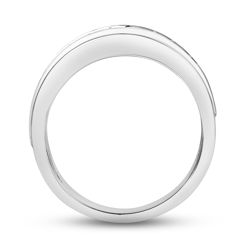 This distinguished wedding band for him showcases a radiant row of channel-set round diamonds. The gleaming 10K white gold band features a striking brushed finish and has a total diamond weight of 1 carat. From the Now and Forever® collection. Available online while supplies last. Previously Owned Treasures are not eligible for in-store pick-up. Previously Owned Treasures may only be shipped either to your home address or to an alternate address. Price comparison based on new item pricing.