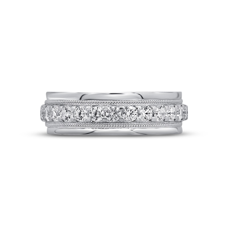 This dashing diamond wedding ring for him has elegant glowing round diamonds encrusted along the 10K white gold band, creating a bold and refined look. The ring has a total diamond weight of 1 carat. Available online while supplies last. Previously Owned Treasures are not eligible for in-store pick-up. Previously Owned Treasures may only be shipped either to your home address or to an alternate address. Price comparison based on new item pricing.