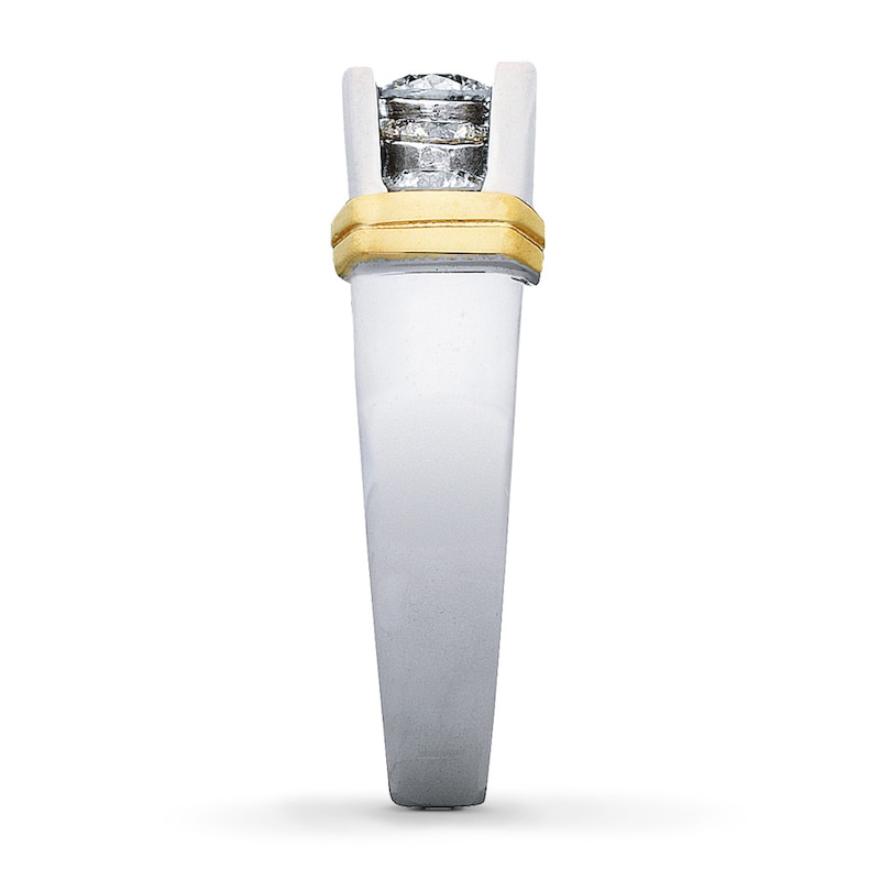 Five near-colorless round diamonds make a handsome statement in this men's wedding band crafted of 14K white gold and accented with 14K yellow gold. This fine jewelry ring has a total diamond weight of 1 carat. Available online while supplies last. Previously Owned Treasures are not eligible for in-store pick-up. Previously Owned Treasures may only be shipped either to your home address or to an alternate address. Price comparison based on new item pricing.