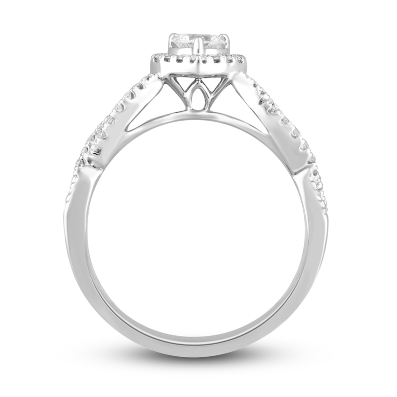 A beautiful 1/4-carat heart-cut diamond shines at the center of this dreamy engagement ring. Set in iconic 14K white gold, brilliant round diamonds halo the center, and more round diamonds shimmer down the twisted band for a total diamond weight of 1/2 carat. From the Now & Forever® bridal collection.