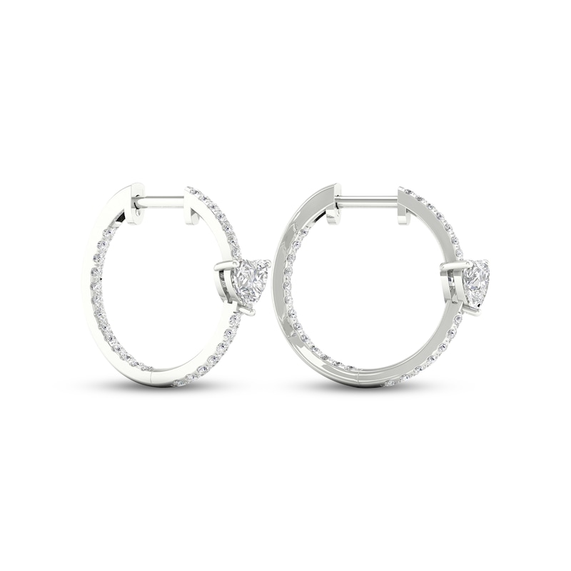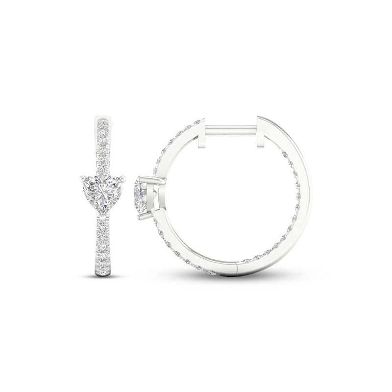 Delightfully dazzling, these huggie hoop earrings showcase a sparkling heart-shaped diamond. Round diamonds sweep down the 14K white gold setting, giving the pair a total diamond weight of 1 carat. The earrings secure with hinged backs.