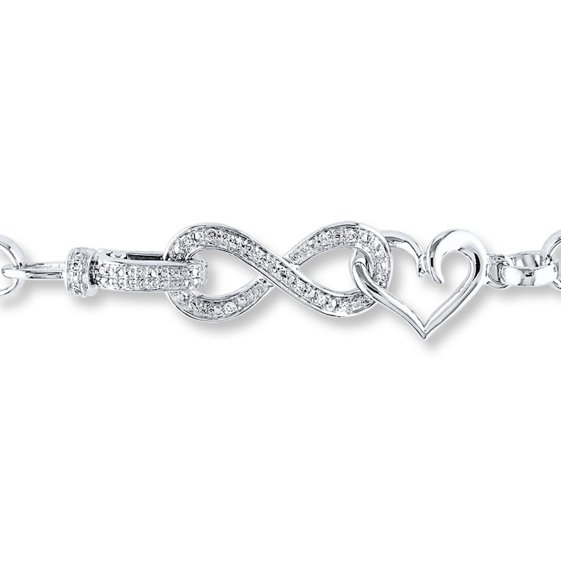 A gleaming sterling silver heart embraces an infinity symbol outlined with glimmering diamonds in this sweet bracelet for her. Totaling 1/10 carat in diamonds, the 7.5-inch chain is secured with a tongue clasp.