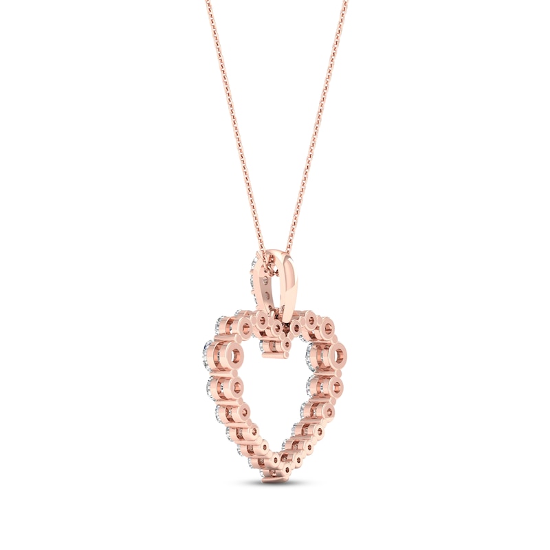 Send all your love with this dazzling heart necklace. Crafted in 10K rose gold, the silhouette is lined with independently certified round-cut lab-created diamonds in varied sizes. More line the bail for a total lab-created diamond weight of 1/2 carat. The pendant suspends along ah cable chain that secures with a lobster clasp and is adjustable from 16 to 17 to 18 inches. From the Lab-Created Diamonds by KAY collection.