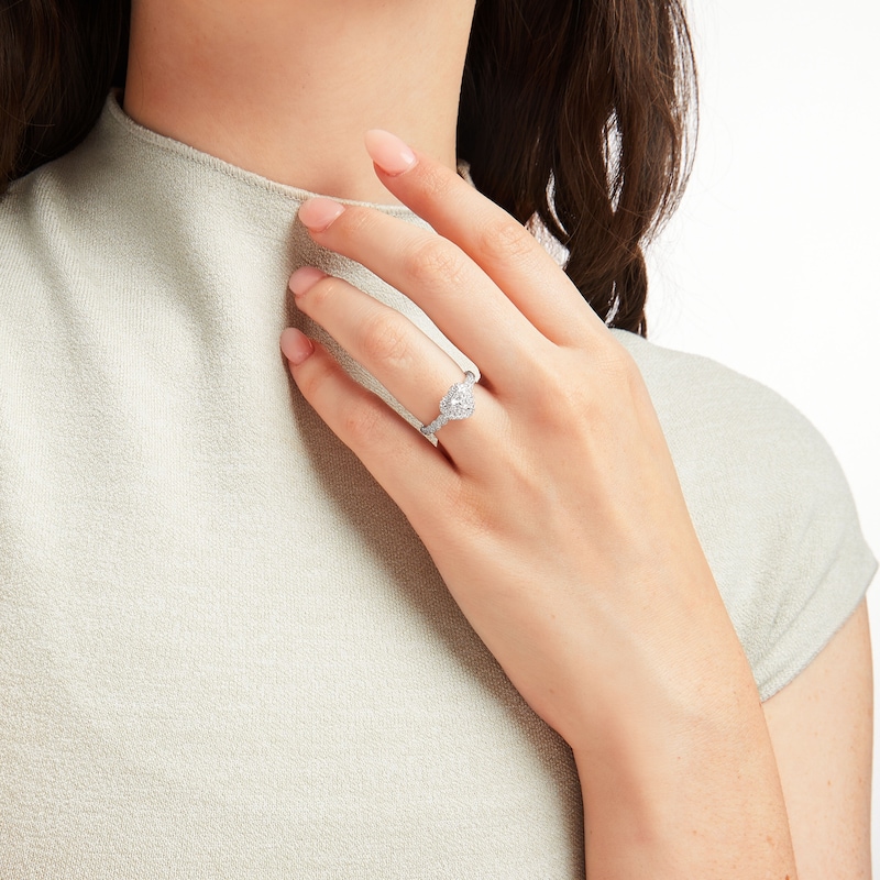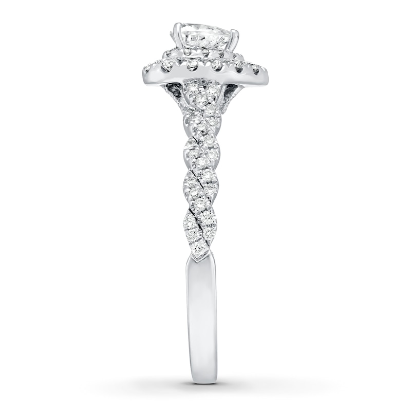 This resplendent engagement ring from Neil Lane Bridal® features a romantic heart-shaped diamond haloed by glimmering round diamonds. The band is adorned with twists of round diamonds, bringing the total diamond weight to 3/4 carat. The ring is styled in 14K white gold.